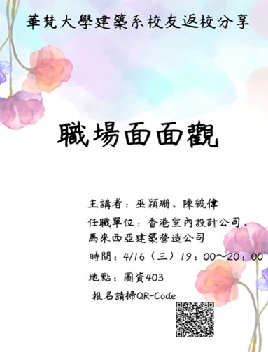 「梵音繞梁,緣聚華梵」,在四月九日至十八日間,校方舉辦的「乙巳年金光明法華梁皇懺供佛齋天勝會」圓滿落幕。藉著法會的因緣,國際處也特別舉辦了「職場面面觀」的講座,邀請了建築系(今智慧生活設計學系空間設計組)的校友巫穎珊與陳虢偉伉儷回到母校,與同學們分享他們的學習經歷和就業心得。